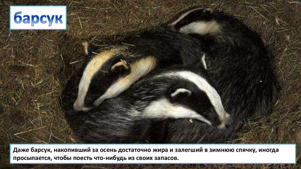 Даже барсук, накопивший за осень достаточно жира и залегший в зимнюю спячку, иногдапросыпается, чтобы поесть что-нибудь из своих запасов.