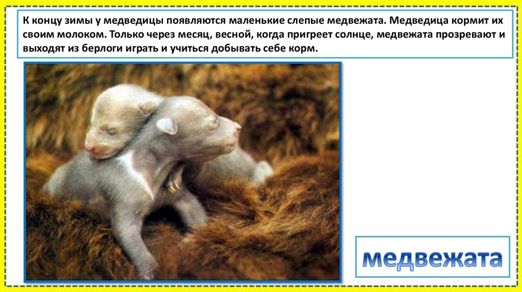 К концу зимы у медведицы появляются маленькие слепые медвежата. Медведица кормит ихсвоим молоком. Только через месяц, весной, когда пригреет солнце, медвежата прозревают и