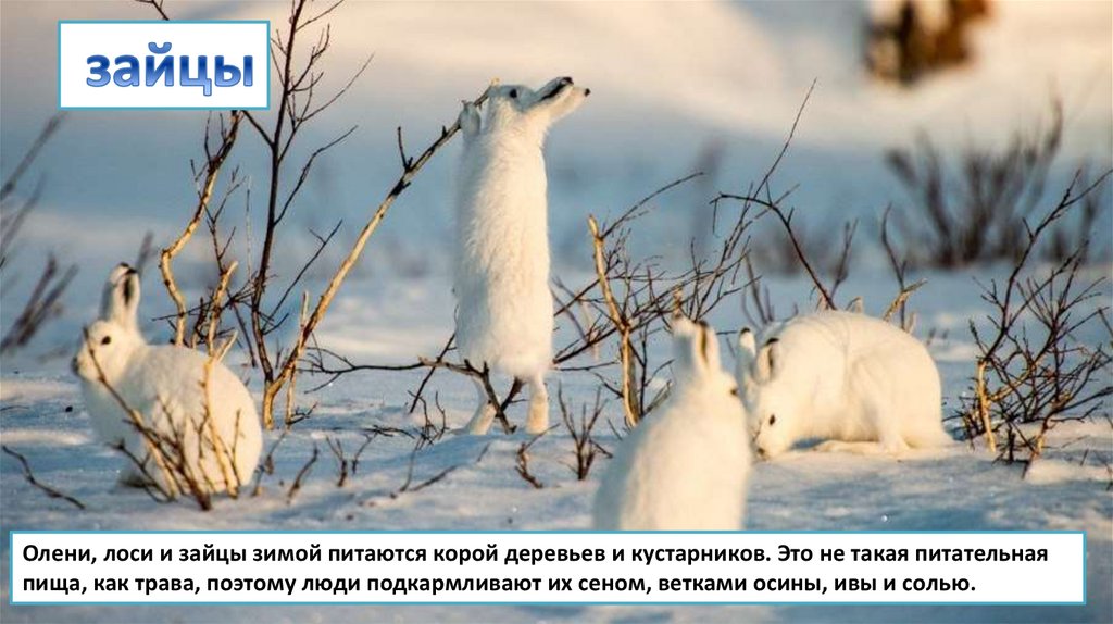 Олени, лоси и зайцы зимой питаются корой деревьев и кустарников. Это не такая питательнаяпища, как трава, поэтому люди подкармливают их сеном, ветками осины, ивы и солью.