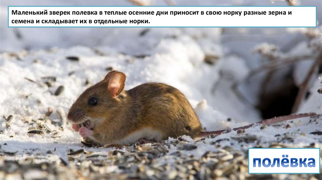 Маленький зверек полевка в теплые осенние дни приносит в свою норку разные зерна исемена и складывает их в отдельные норки.