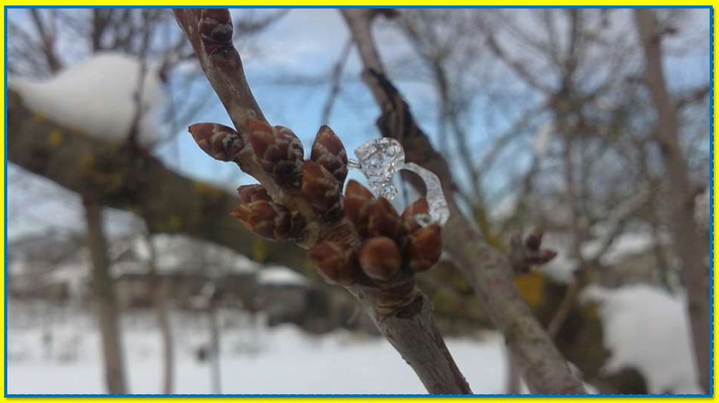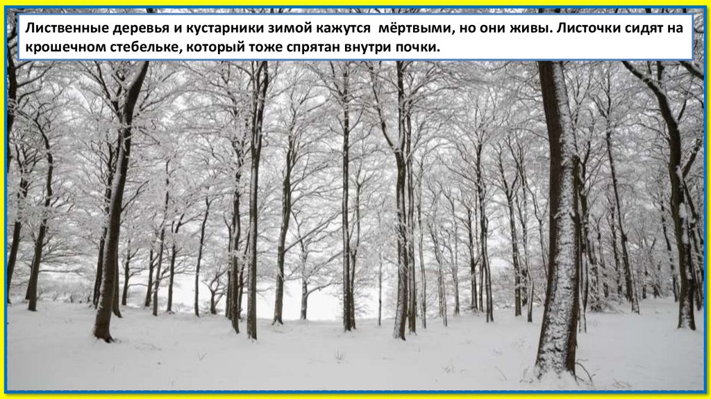 Лиственные деревья и кустарники зимой кажутся мёртвыми, но они живы. Листочки сидят накрошечном стебельке, который тоже спрятан внутри почки.