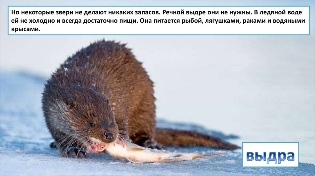 Но некоторые звери не делают никаких запасов. Речной выдре они не нужны. В ледяной водеей не холодно и всегда достаточно пищи. Она питается рыбой, лягушками, раками и водяными