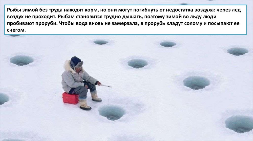 Рыбы зимой без труда находят корм, но они могут погибнуть от недостатка воздуха: через ледвоздух не проходит. Рыбам становится трудно дышать, поэтому зимой во льду люди