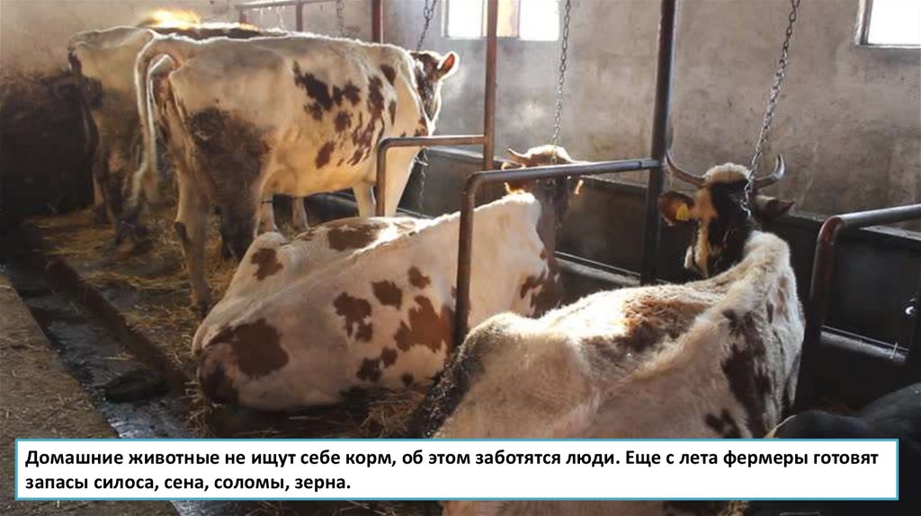Домашние животные не ищут себе корм, об этом заботятся люди. Еще с лета фермеры готовятзапасы силоса, сена, соломы, зерна.