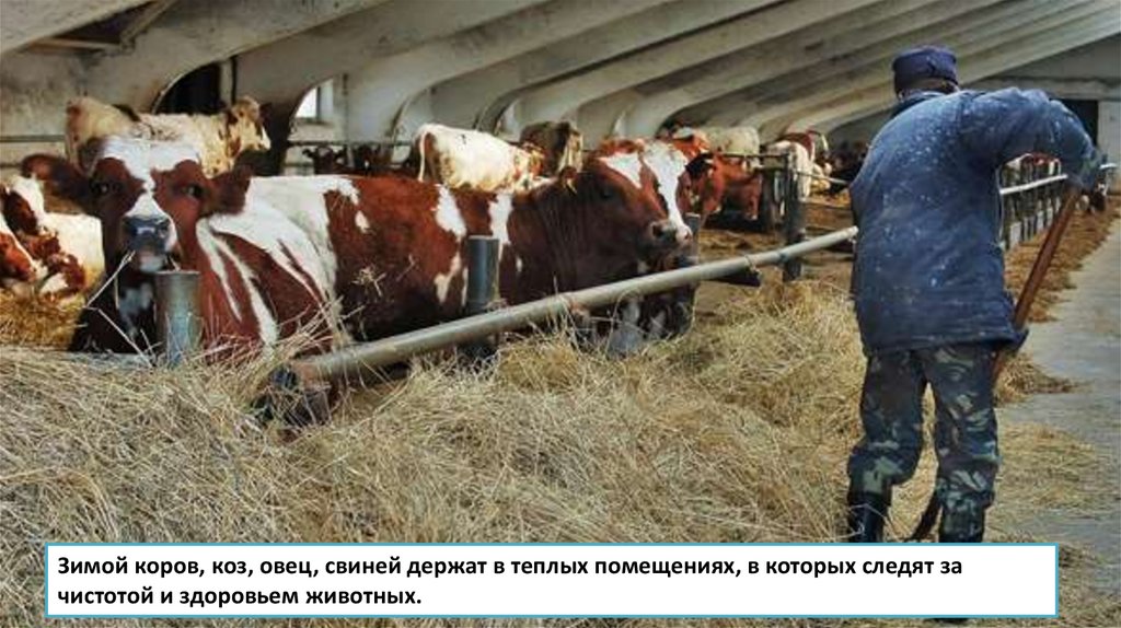 Зимой коров, коз, овец, свиней держат в теплых помещениях, в которых следят зачистотой и здоровьем животных.