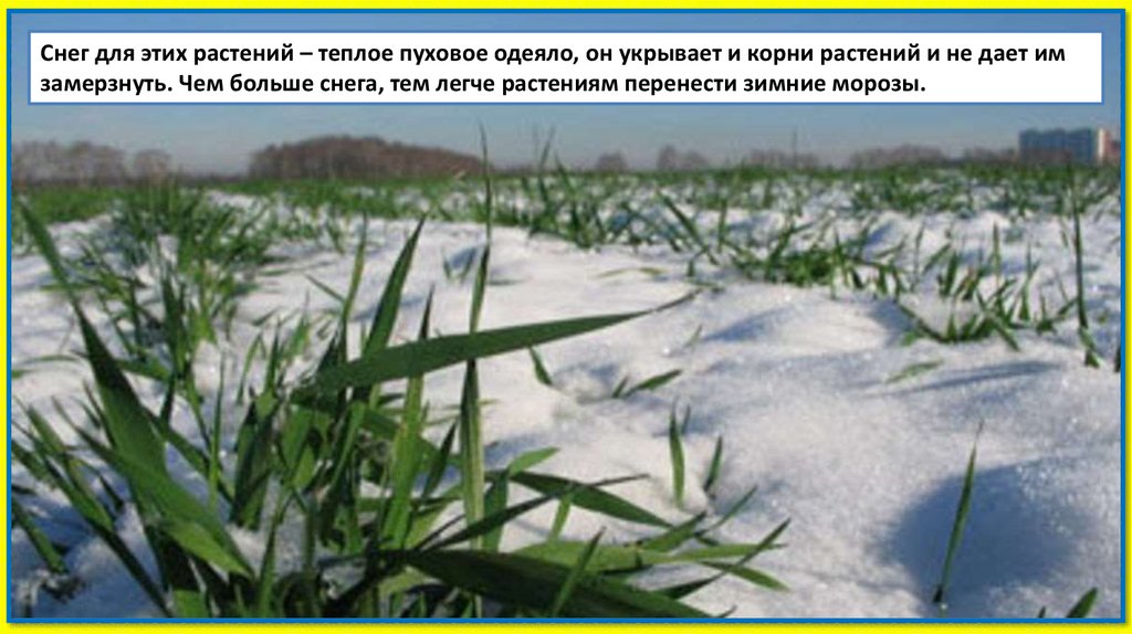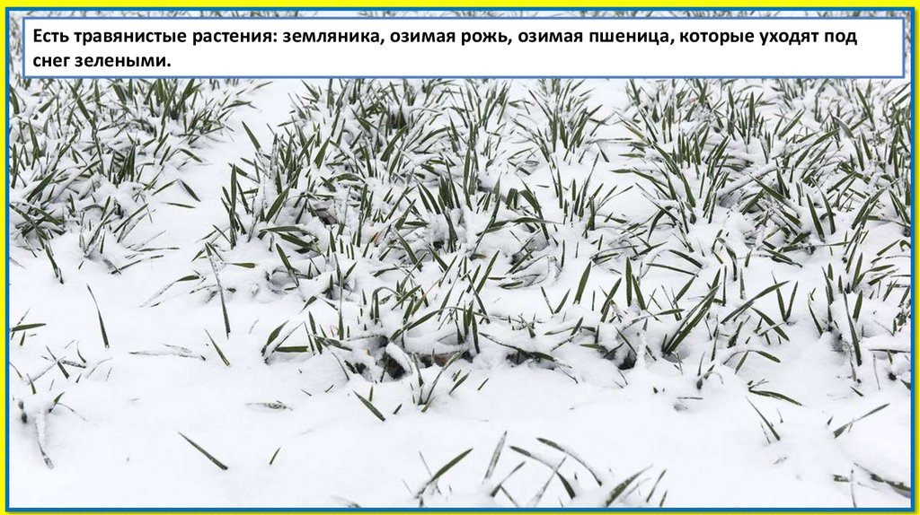 Есть травянистые растения: земляника, озимая рожь, озимая пшеница, которые уходят подснег зелеными.