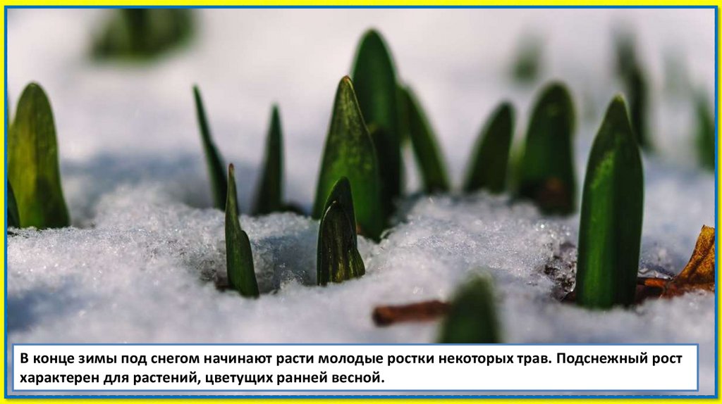 В конце зимы под снегом начинают расти молодые ростки некоторых трав. Подснежный ростхарактерен для растений, цветущих ранней весной.