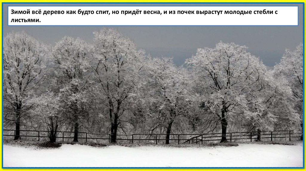 Зимой всё дерево как будто спит, но придёт весна, и из почек вырастут молодые стебли слистьями.