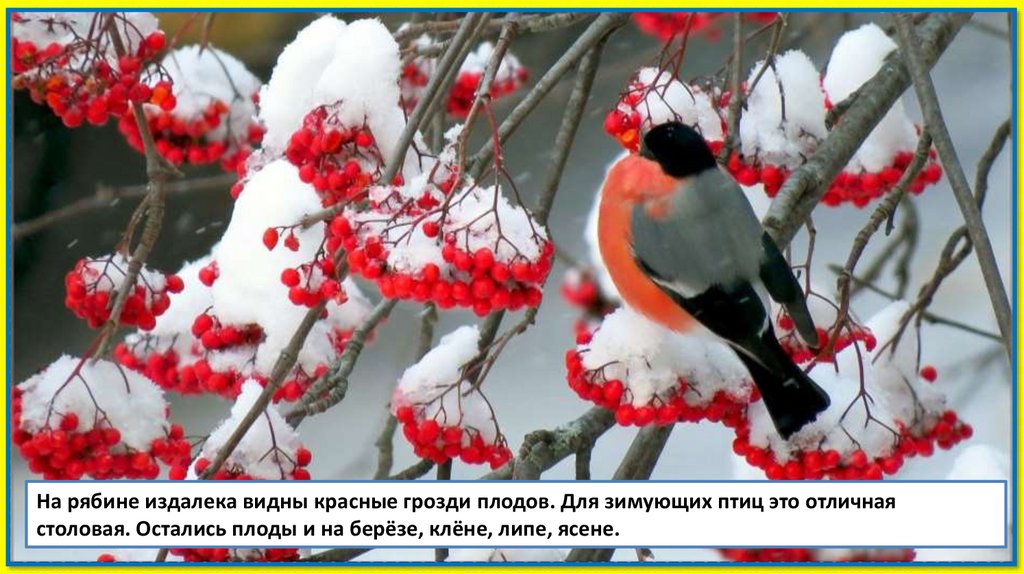 На рябине издалека видны красные грозди плодов. Для зимующих птиц это отличнаястоловая. Остались плоды и на берёзе, клёне, липе, ясене.