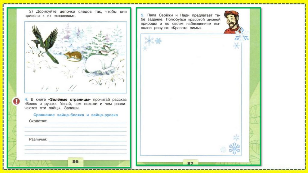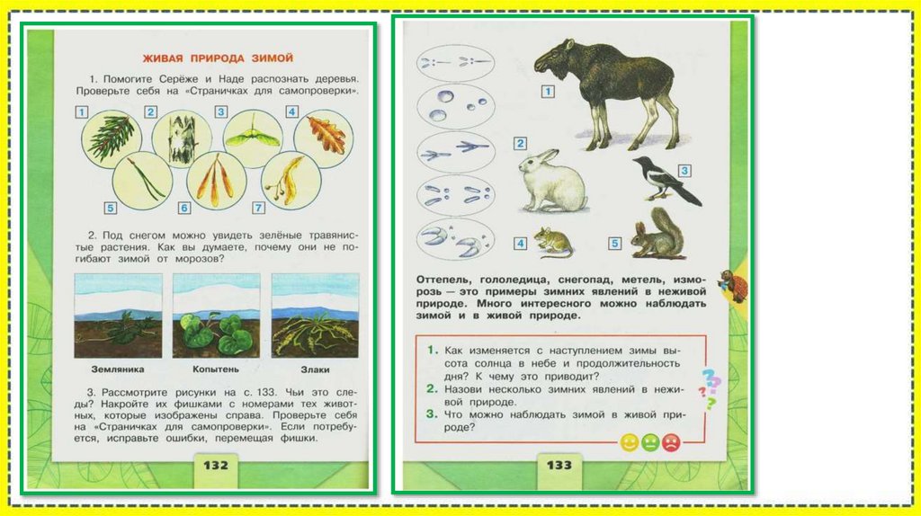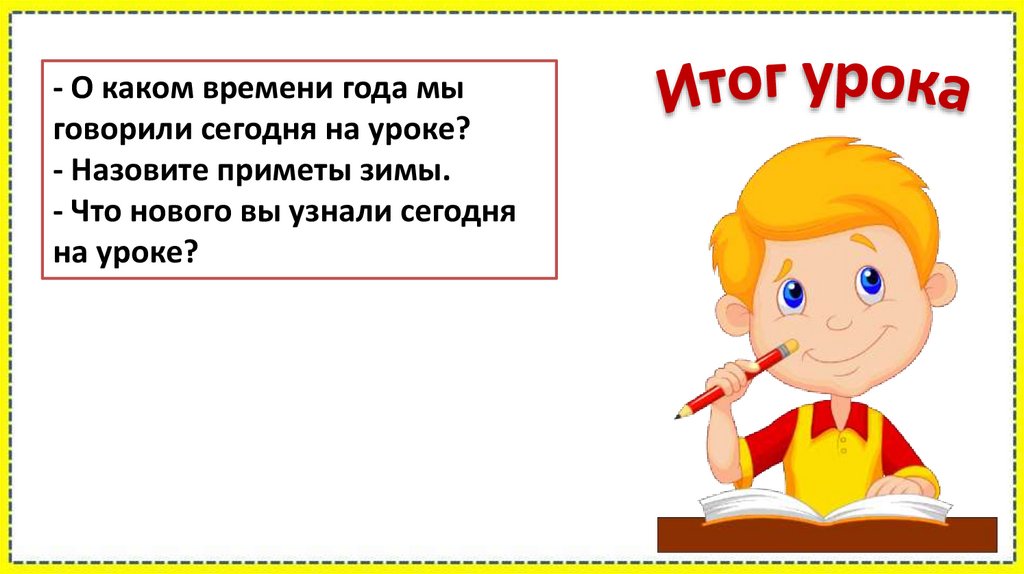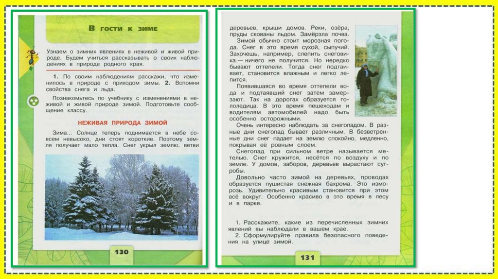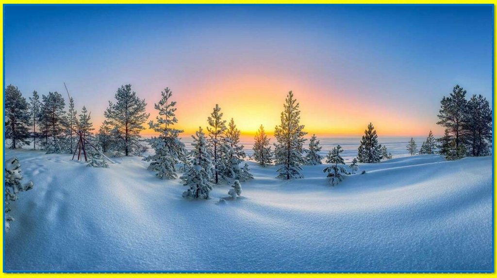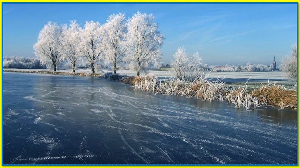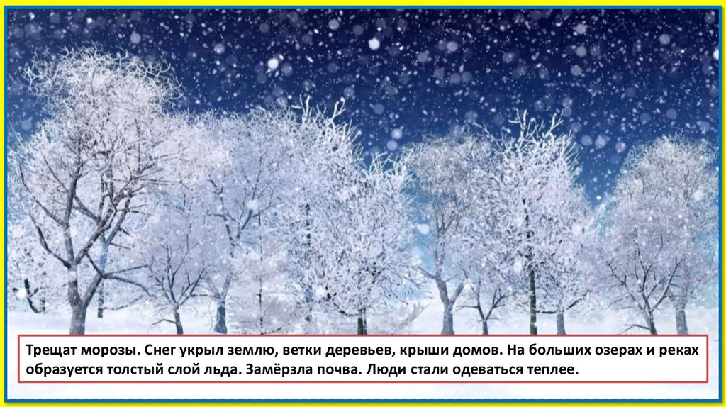 Трещат морозы. Снег укрыл землю, ветки деревьев, крыши домов. На больших озерах и рекахобразуется толстый слой льда. Замёрзла почва. Люди стали одеваться теплее.