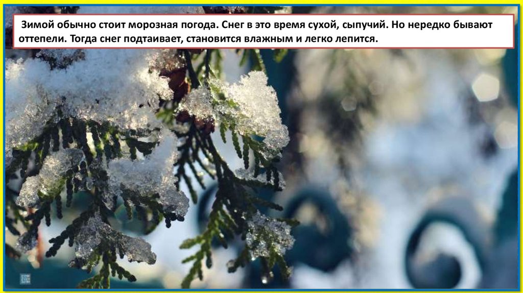 Зимой обычно стоит морозная погода. Снег в это время сухой, сыпучий. Но нередко бываютоттепели. Тогда снег подтаивает, становится влажным и легко лепится.