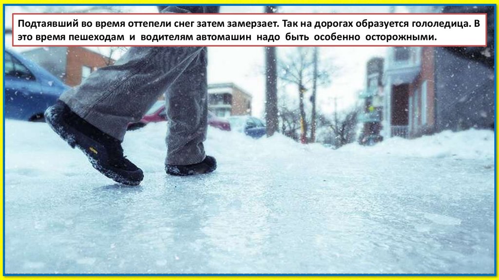 Подтаявший во время оттепели снег затем замерзает. Так на дорогах образуется гололедица. Вэто время пешеходам и водителям автомашин надо быть особенно осторожными.