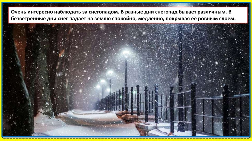 Очень интересно наблюдать за снегопадом. В разные дни снегопад бывает различным. Вбезветренные дни снег падает на землю спокойно, медленно, покрывая её ровным слоем.