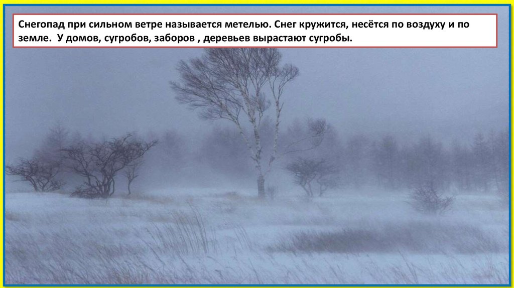 Снегопад при сильном ветре называется метелью. Снег кружится, несётся по воздуху и поземле. У домов, сугробов, заборов , деревьев вырастают сугробы.