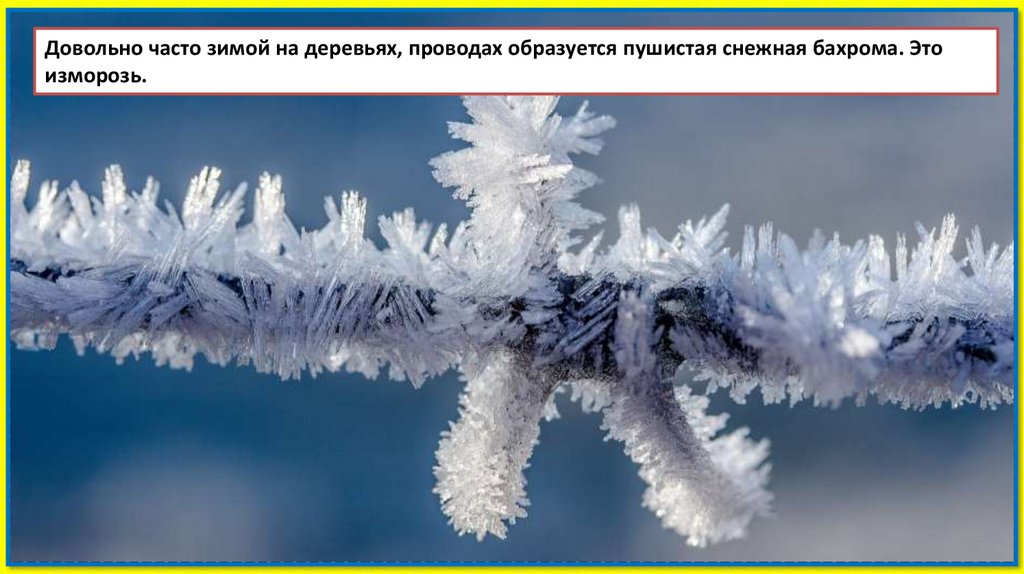 Довольно часто зимой на деревьях, проводах образуется пушистая снежная бахрома. Этоизморозь.