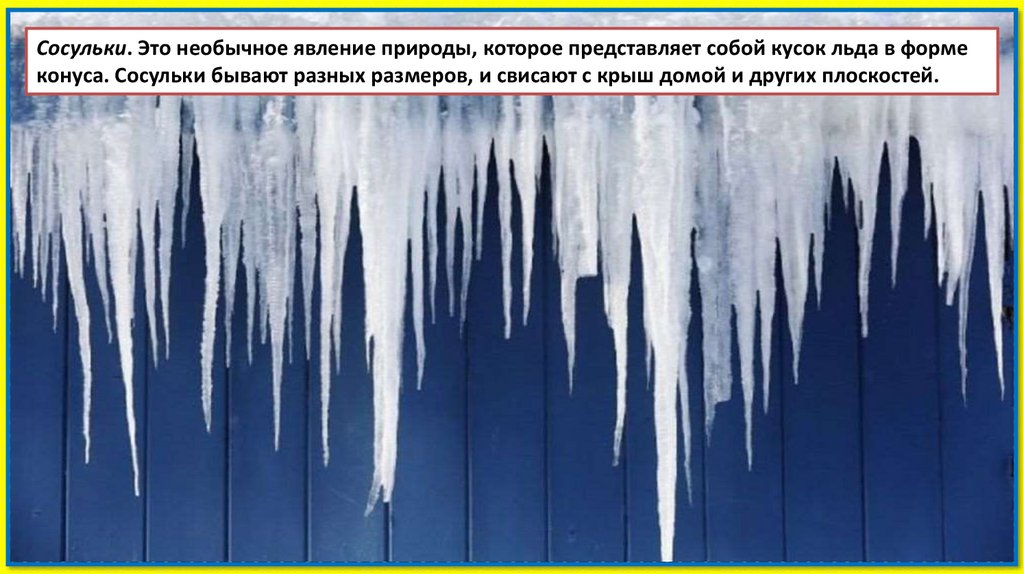 Сосульки. Это необычное явление природы, которое представляет собой кусок льда в формеконуса. Сосульки бывают разных размеров, и свисают с крыш домой и других плоскостей.