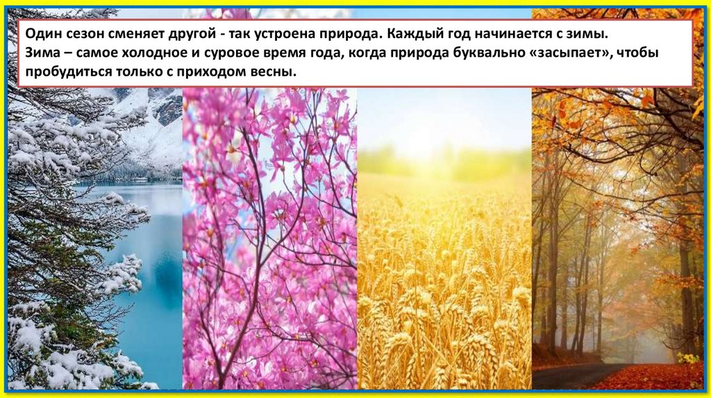 Один сезон сменяет другой - так устроена природа. Каждый год начинается с зимы.Зима – самое холодное и суровое время года, когда природа буквально «засыпает», чтобы