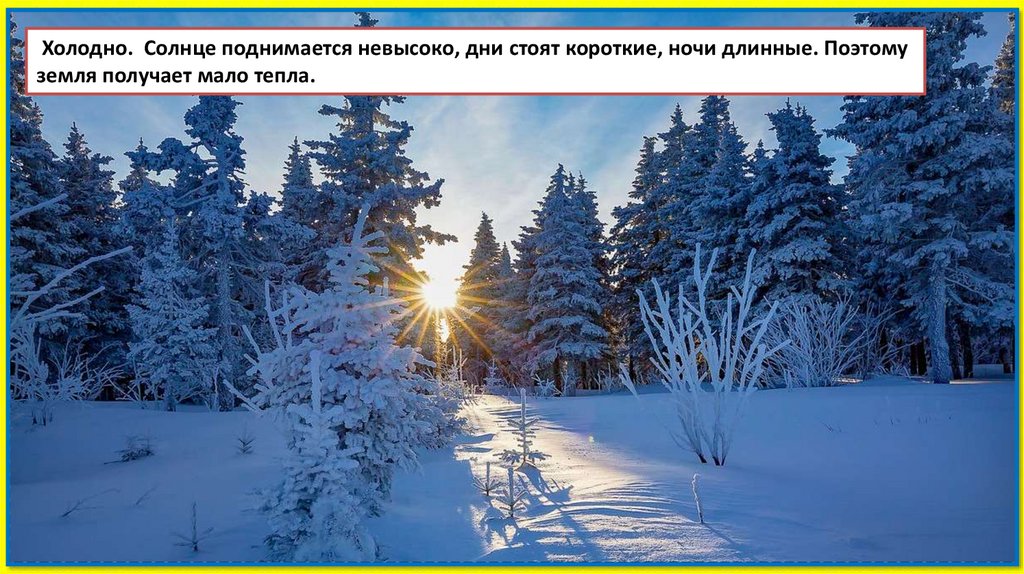 Холодно. Солнце поднимается невысоко, дни стоят короткие, ночи длинные. Поэтомуземля получает мало тепла.