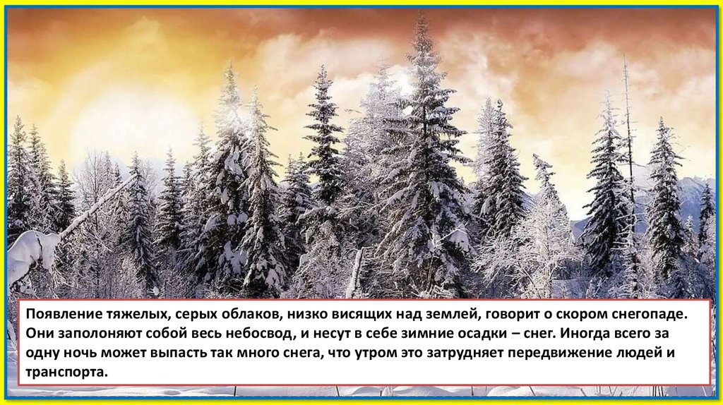 Появление тяжелых, серых облаков, низко висящих над землей, говорит о скором снегопаде.Они заполоняют собой весь небосвод, и несут в себе зимние осадки – снег. Иногда всего за