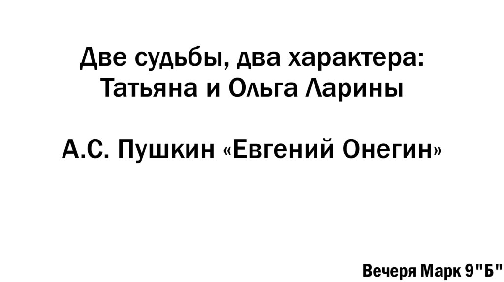 1. Две судьбы, два характера: Татьяна и Ольга Ларины А.С. Пушкин «Евгений Онегин»