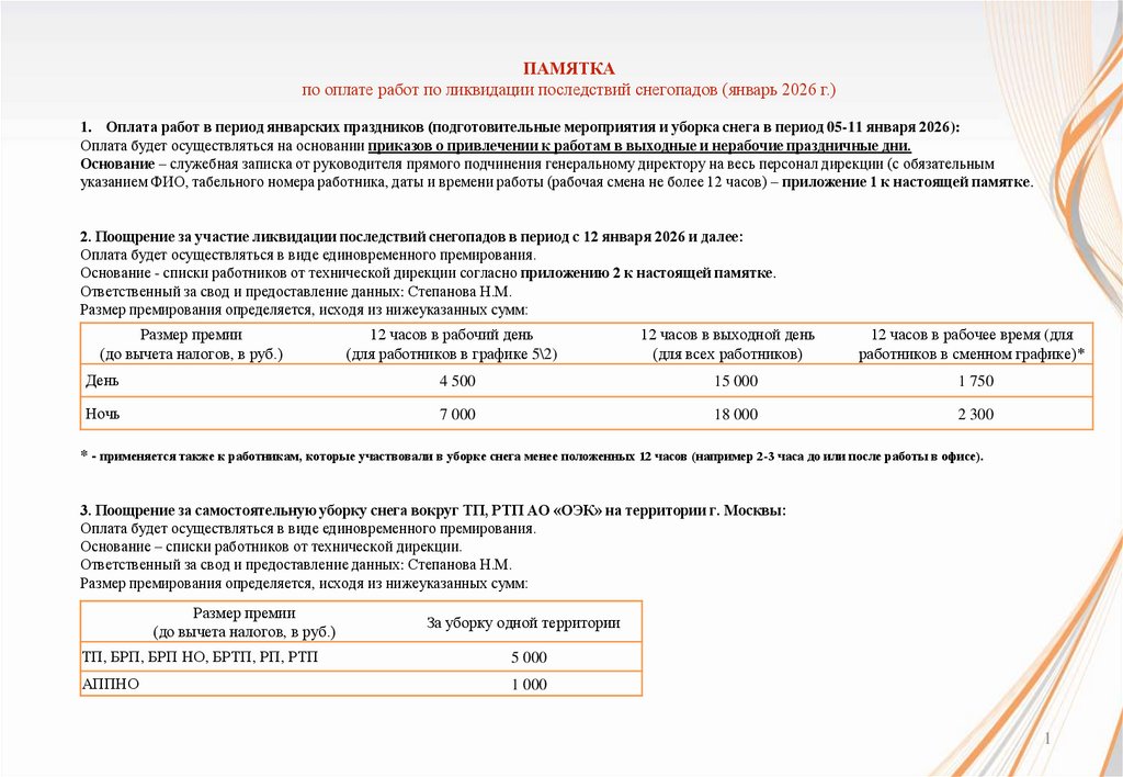 1. Оплата работ в период январских праздников (подготовительные мероприятия и уборка снега в период 05-11 января 2026):