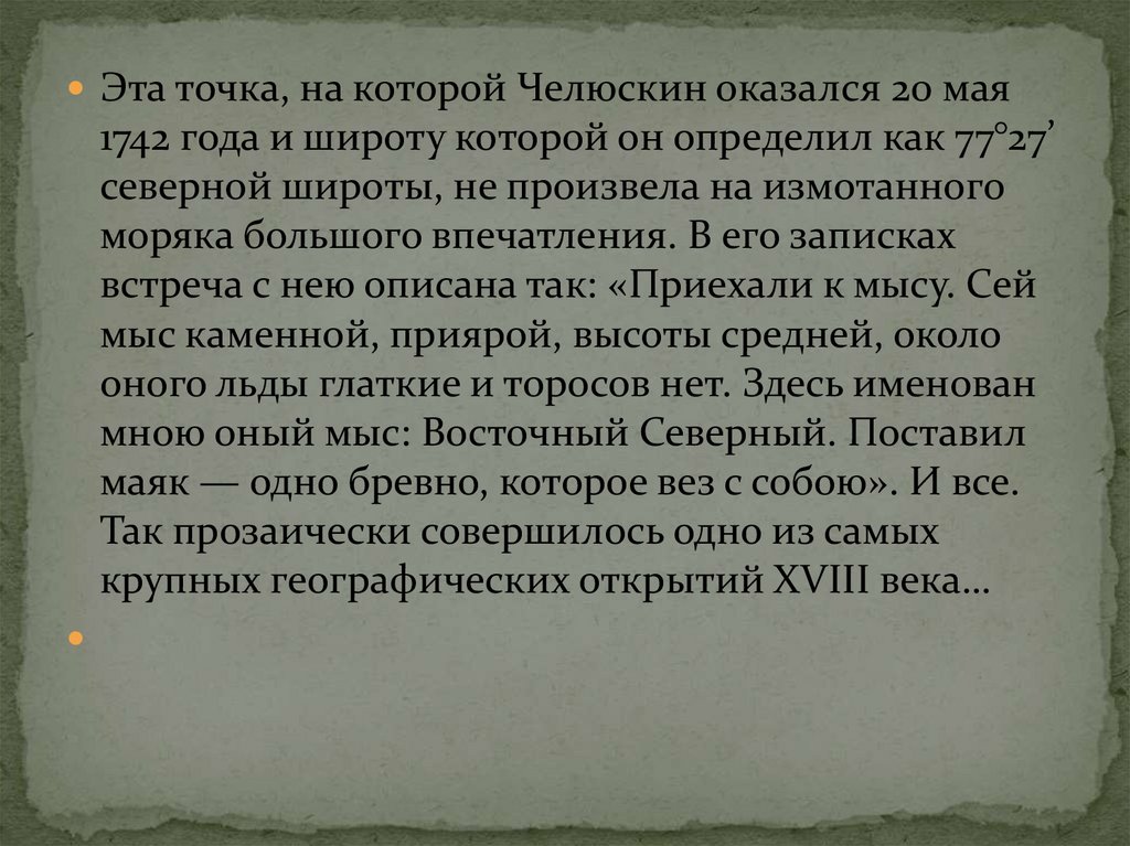 Эта точка, на которой Челюскин оказался 20 мая1742 года и широту которой он определил как 77°27’