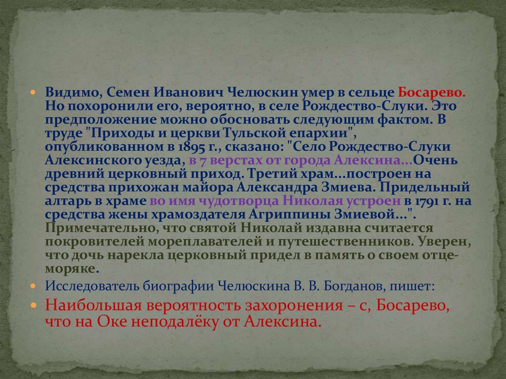 Видимо, Семен Иванович Челюскин умер в сельце Босарево.Но похоронили его, вероятно, в селе Рождество-Слуки. Это