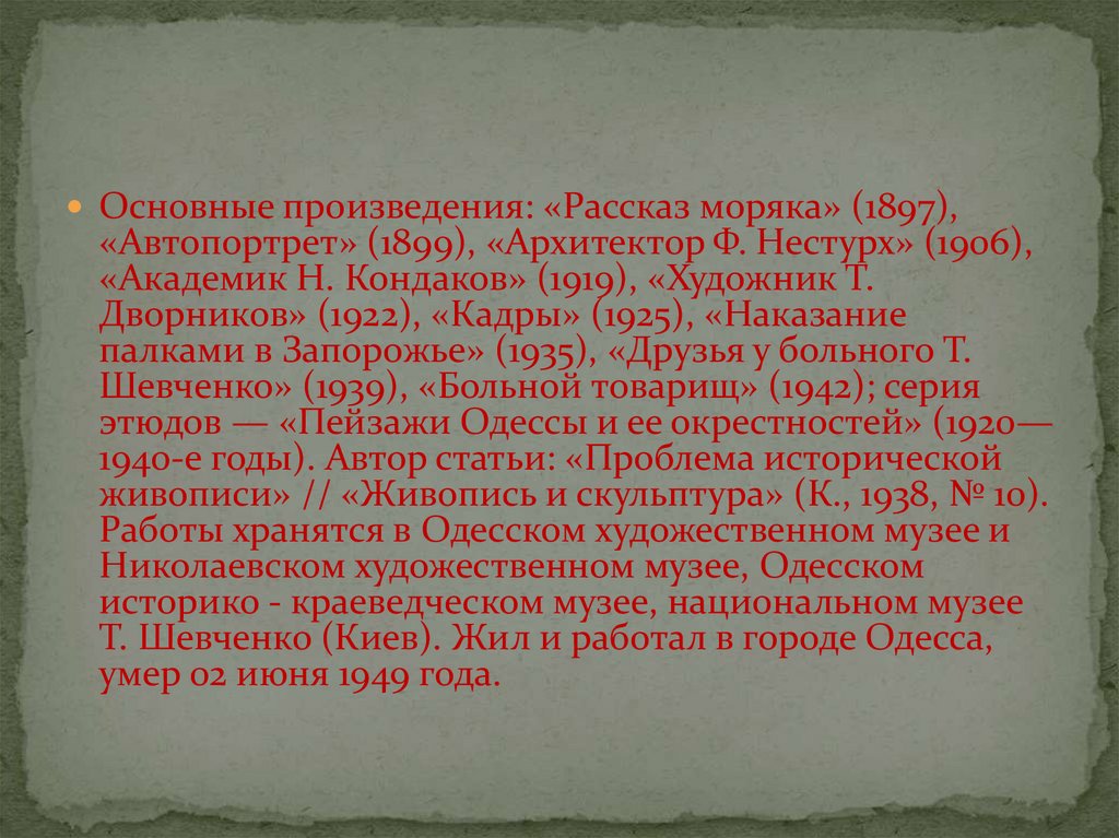 Основные произведения: «Рассказ моряка» (1897),«Автопортрет» (1899), «Архитектор Ф. Нестурх» (1906),