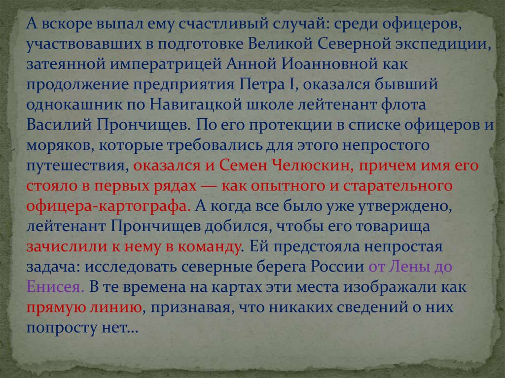 А вскоре выпал ему счастливый случай: среди офицеров,участвовавших в подготовке Великой Северной экспедиции,