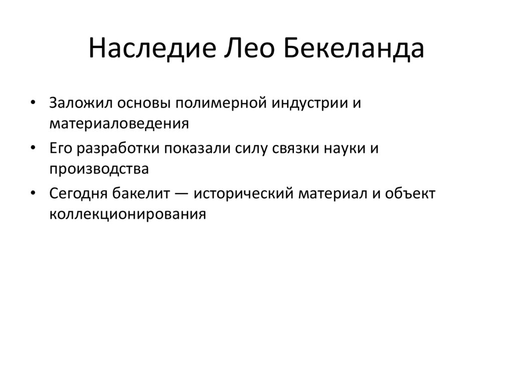 Наследие Лео Бекеланда• Заложил основы полимерной индустрии и