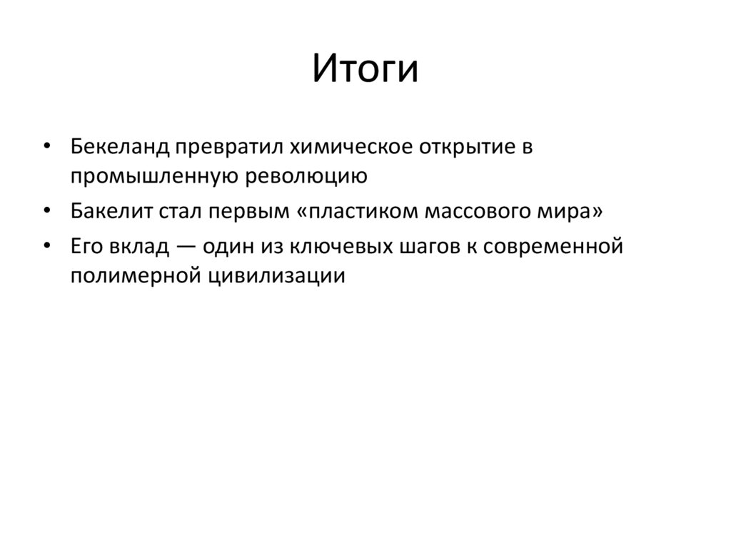 Итоги• Бекеланд превратил химическое открытие в