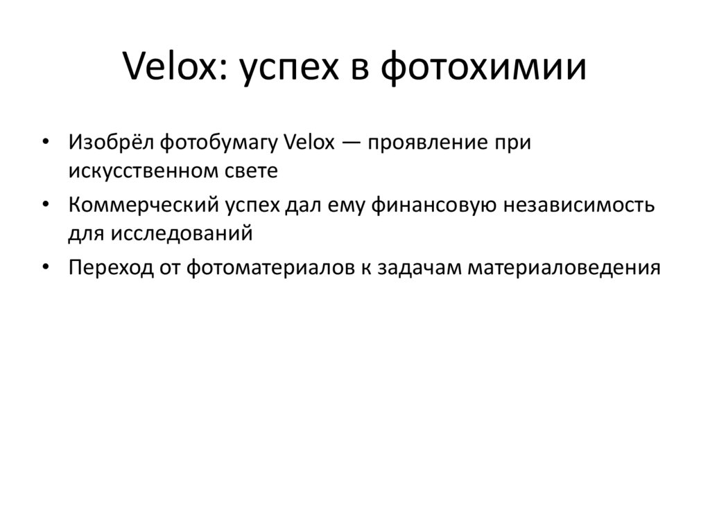 Velox: успех в фотохимии• Изобрёл фотобумагу Velox — проявление при