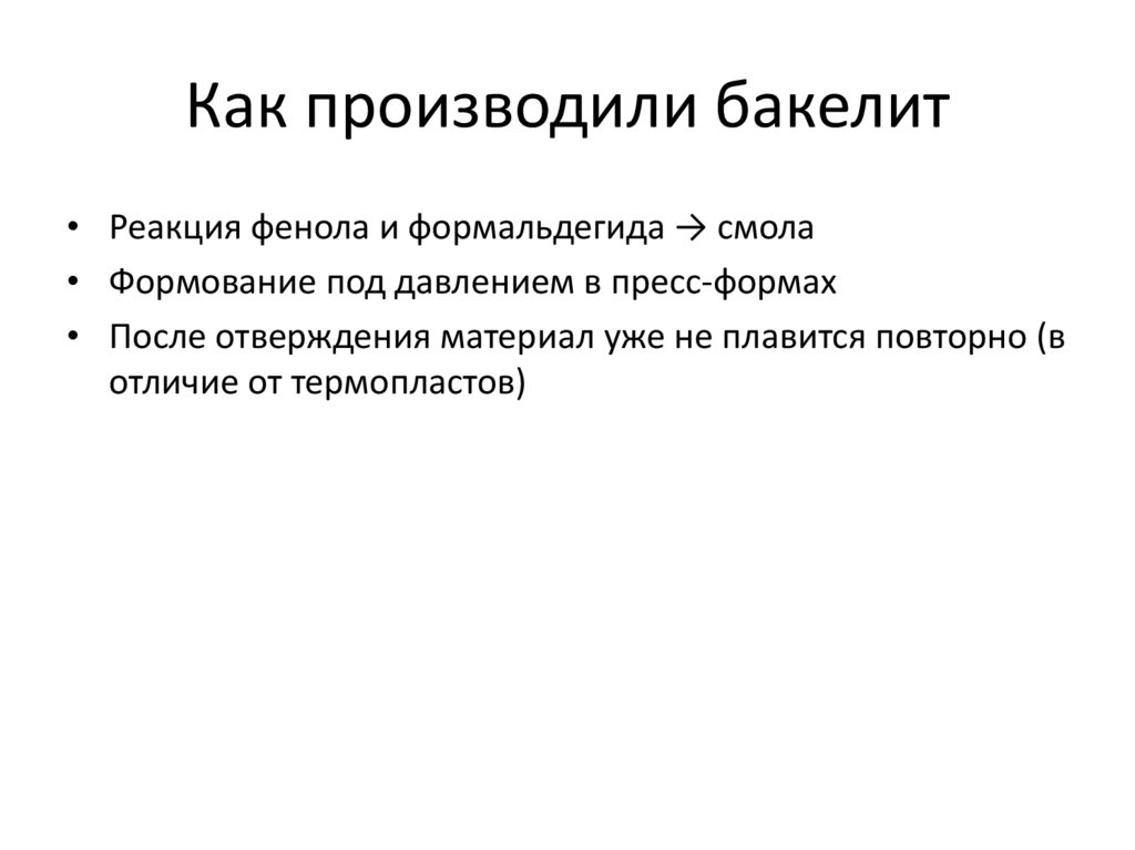 Как производили бакелит• Реакция фенола и формальдегида → смола