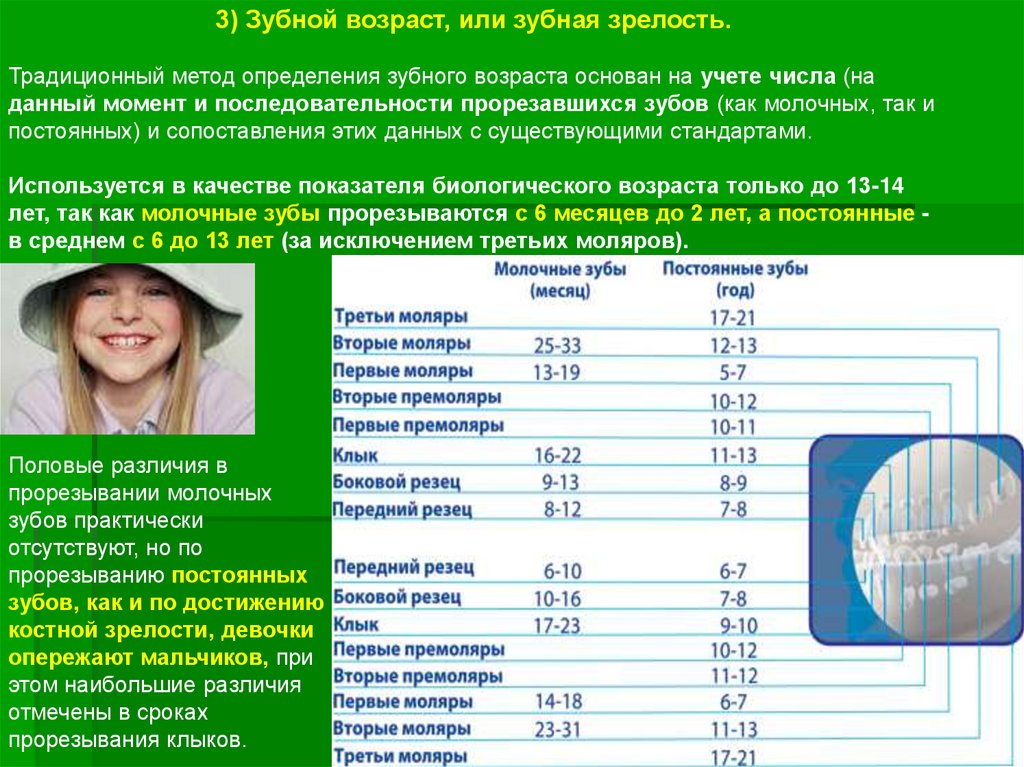 3) Зубной возраст, или зубная зрелость.Традиционный метод определения зубного возраста основан на учете числа (на