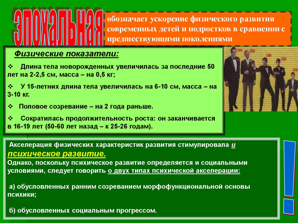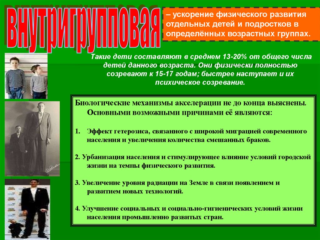– ускорение физического развитияотдельных детей и подростков в