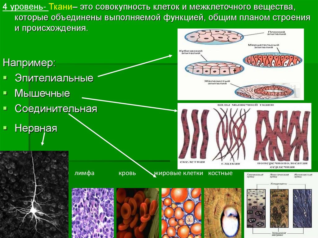4 уровень- Ткани– это совокупность клеток и межклеточного вещества,которые объединены выполняемой функцией, общим планом строения