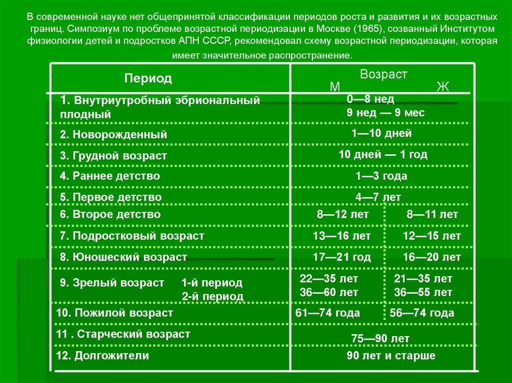 В современной науке нет общепринятой классификации периодов роста и развития и их возрастныхграниц. Симпозиум по проблеме возрастной периодизации в Москве (1965), созванный Институтом