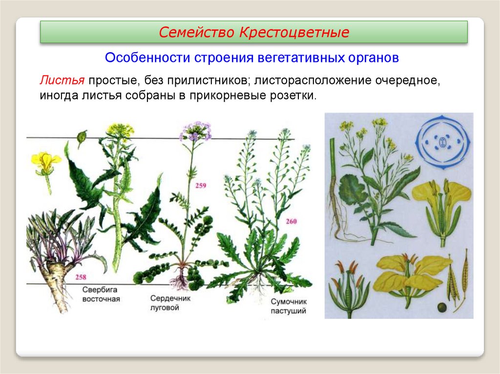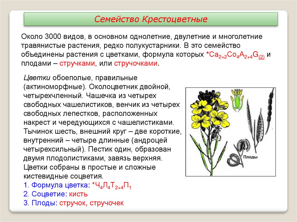 Семейство КрестоцветныеОколо 3000 видов, в основном однолетние, двулетние и многолетние