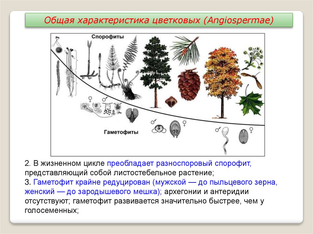 Общая характеристика цветковых (Angiospermae)2. В жизненном цикле преобладает разноспоровый спорофит,