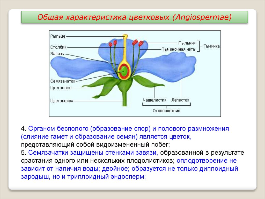 Общая характеристика цветковых (Angiospermae)4. Органом бесполого (образование спор) и полового размножения