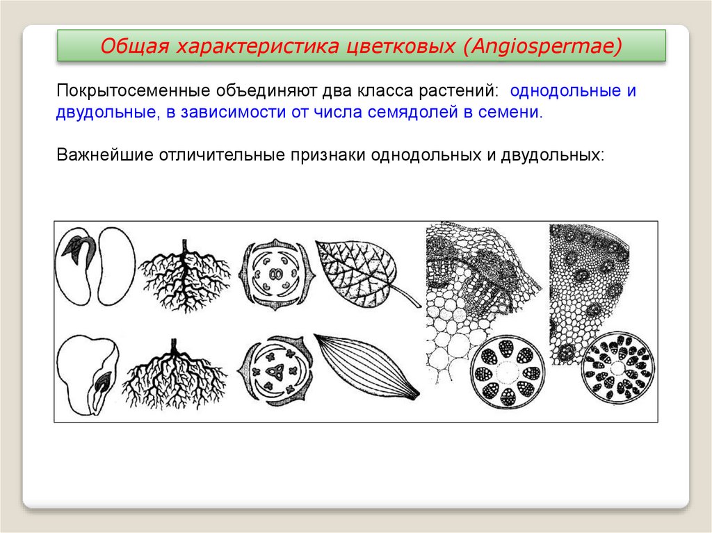 Общая характеристика цветковых (Angiospermae)Покрытосеменные объединяют два класса растений: однодольные и
