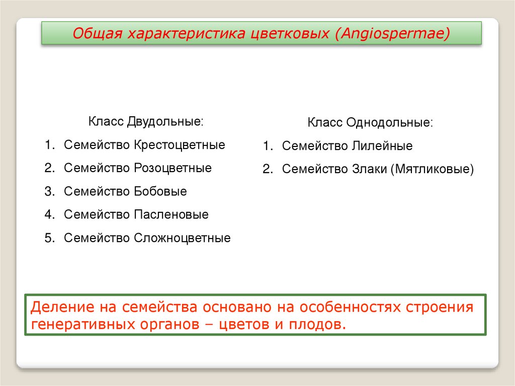 Общая характеристика цветковых (Angiospermae)Класс Двудольные: