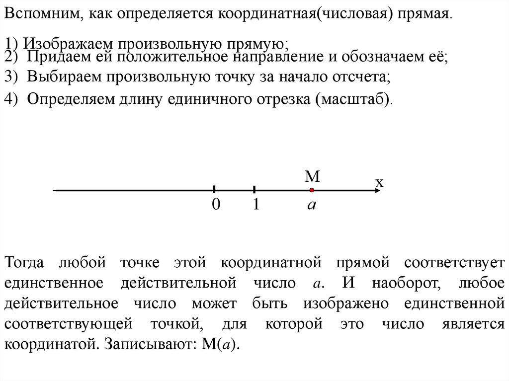 Вспомним, как определяется координатная(числовая) прямая.1) Изображаем произвольную прямую;