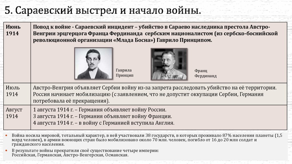Повод к войне - Сараевский инцидент – убийство в Сараево наследника престола АвстроВенгрии эрцгерцога Франца Фердинанда сербским националистом (из сербско-боснийской
