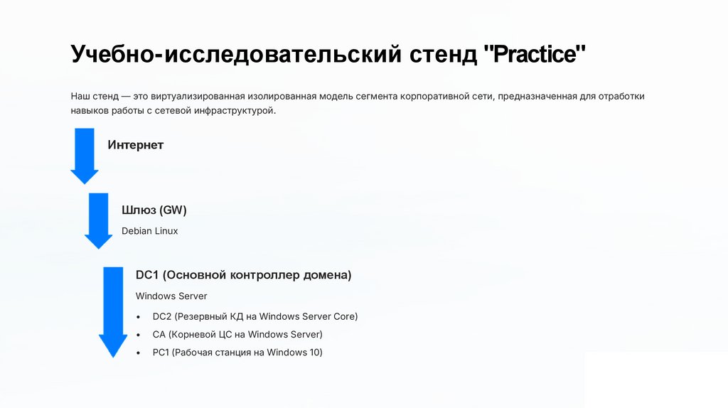 Учебно-исследовательский стенд "Practice"Наш стенд — это виртуализированная изолированная модель сегмента корпоративной сети, предназначенная для отработки
