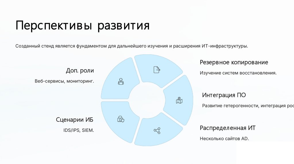 Перспектив ы развитияСозданный стенд является фундаментом для дальнейшего изучения и расширения ИТ-инфраструктуры.
