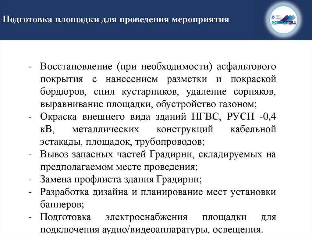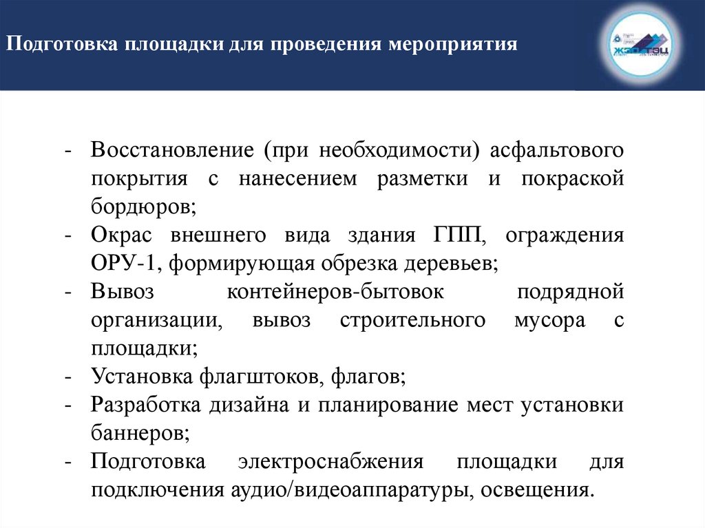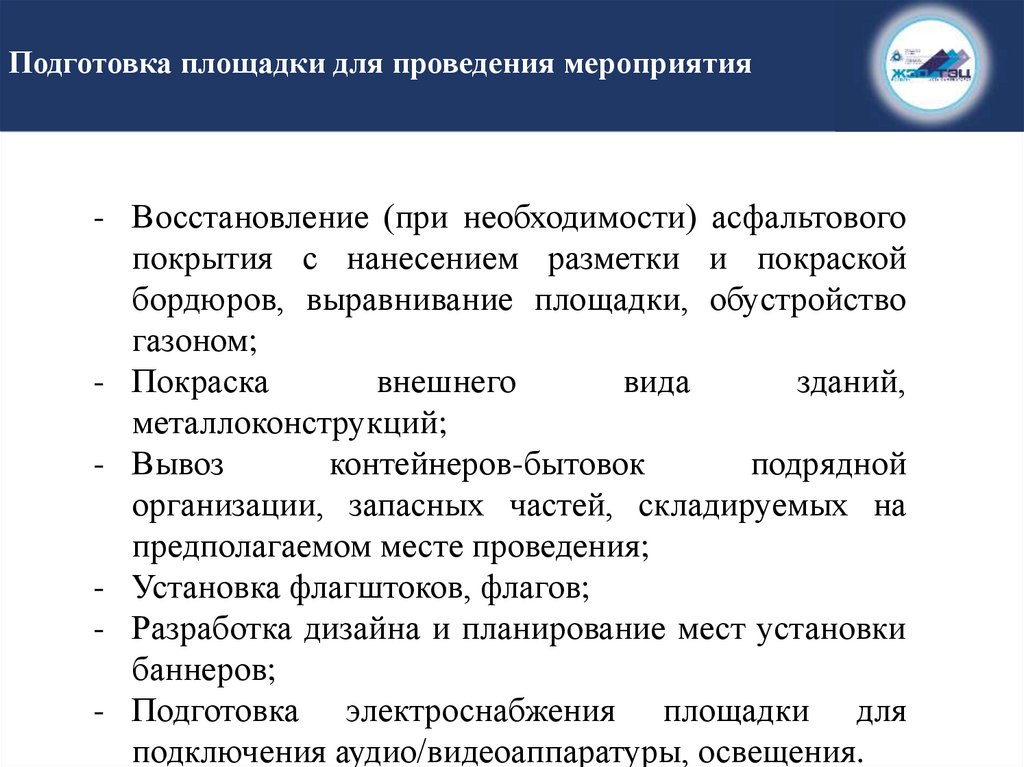 Подготовка площадки для проведения мероприятия- Восстановление (при необходимости) асфальтового