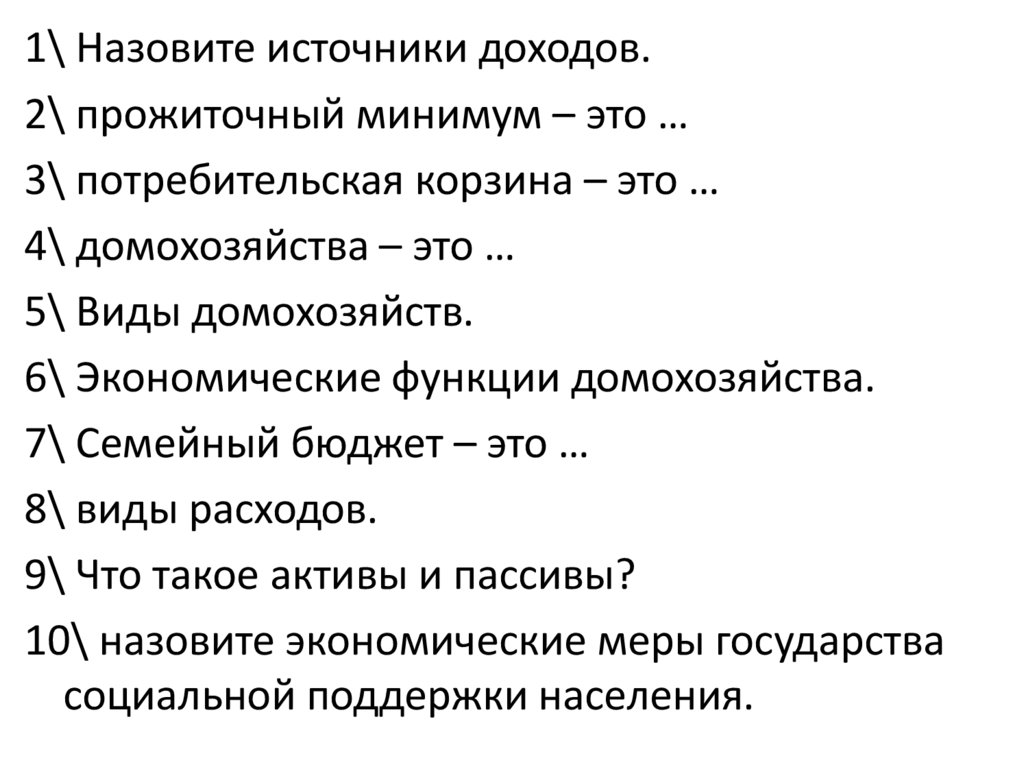 1\ Назовите источники доходов.2\ прожиточный минимум – это …