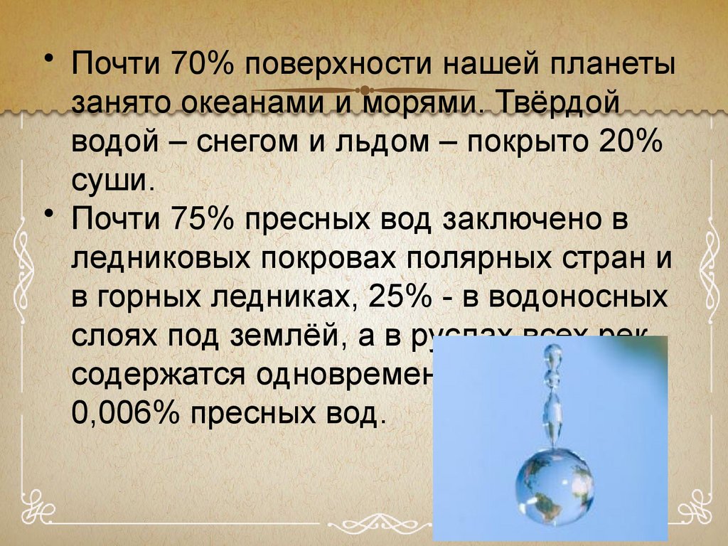 • Почти 70% поверхности нашей планетызанято океанами и морями. Твёрдой