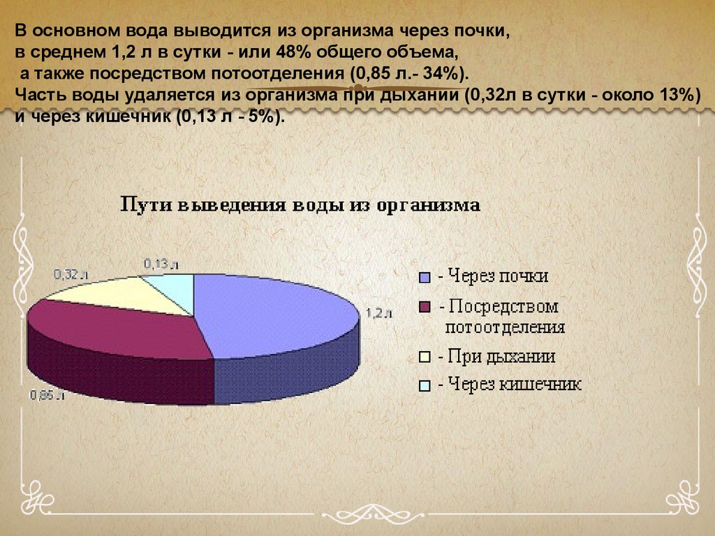 Часть воды удаляется из организма при дыхании (0,32л в сутки - около 13%)